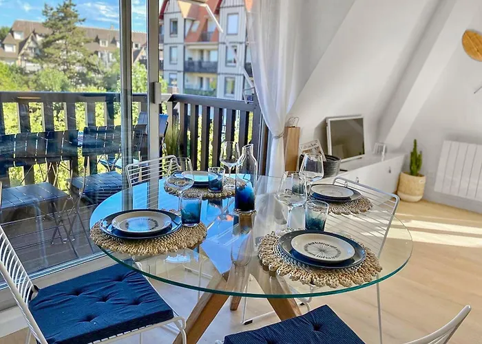 Boendet har ett privat läge, inom 3 km från Deauville golfbana och inom 2 km från Trouvilles casino. Paléospace ligger cirka 10 minuters bilresa från den 37 m² stora lägenheten.